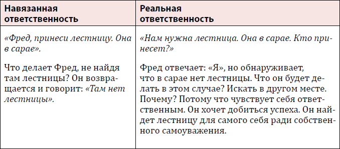 Подобное характерно и для управления людьми. Раньше можно было подталкивать людей и указывать им, что делать. Теперь люди ждут другого отношения к себе. Подсознательно люди желают взять на себя выбор и ответственность. Однако многие руководители так и остаются на позициях проталкивания. Вместо того чтобы подталкивать людей, нужно дать им выбор и ответственность.