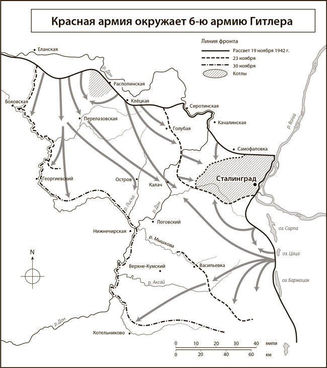 16 декабря река замерзла, и вскоре лед стал достаточно крепким, чтобы выдержать грузовики и пушки. В руинах Сталинграда стихли рукопашные бои, основные сражения происходили теперь к югу и западу от города. Через пять дней советские танки взяли Шестую армию Паулюса в идеальное двойное кольцо: передовые отряды Жукова соединились к востоку от переправы через Дон возле Калача. Много раз в ходе войны Красной армии удавалось провести подобную операцию, и почти всегда немцы вырывались из котла. На этот раз Гитлер остался глух к призывам командующего Шестой армии, умолявшего дать приказ об отступлении. Вместо этого Паулюсу было приказано продолжать осаду Сталинграда, а Манштейн двинулся с запада на воссоединение с Шестой армией. К 23-му передовые отряды Манштейна оказались в 50 км от Сталинграда. До этого рубежа им удалось пробиться, но там они застряли. Фельдмаршал советовал Паулюсу пренебречь распоряжениями Гитлера и пробиваться навстречу. В тот момент избавление еще было возможно, однако Паулюс не воспользовался этим шансом и обрек 200 000 человек на смерть или плен. Манштейн, исчерпав свои силы, отдал приказ об общем отступлении.