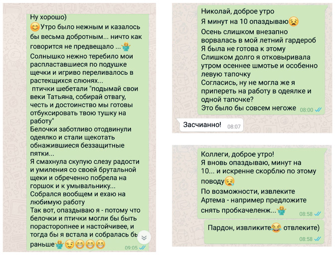 Так вот, почти каждое свое опоздание я письменно или устно обосновываю руководителю и коллегам в юмористической форме, и заходит это на ура! Так я, еще не появившись на работе, уже поднимаю всем настроение! Прикрепляю несколько скриншотов своих отписулек.