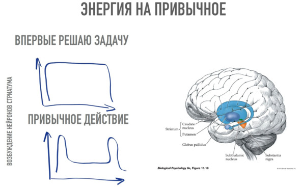 Теперь вернемся к модели Канемана. Выполнение привычных действий означает возбуждение сформированных устойчивых ансамблей нейронов, оно задействует малое количество нейронов, а возбуждение большого количества нейронов выполняется лишь в точках выбора. В то время как размышления, медленное мышление требует возбуждения большого количества нейронов в коре. Разница потребления дофамина между режимами быстрого и медленного мышления – примерно в 9 раз, как это показано на схеме из доклада Анны Обуховой «Как помочь людям меняться» (видео) на AgileDays-2021.
