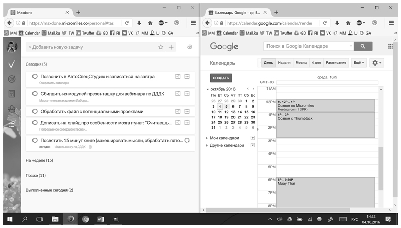 [Закрыть]. В ОС Windows есть прекрасная возможность аккуратно расположить два окна на одном экране: выбираете первое окно и нажимаете Win-Left, после чего выбираете второе окно. Смотрите на рис. 34, я таким образом «интегрировал» свой список задач (maxdone.micromiles.co) со своим календарем (Google Calendar), причем при этой интеграции не пострадал ни один программист. Есть еще одна техника «программистолюбивой» интеграции: скопируйте URL письма, статьи или любого другого кусочка информации, добавьте его в описание нужной задачи, и вуаля! – потом по одному клику из задачи вы сможете попасть в нужное вам место. Если вас воротит от подобного рода ручной «интеграции», помните: автоматическая интеграция лишает содержимое вашего списка задач осмысленности. А мы не делаем того, что страстно хотим сделать, не потому, что тратим драгоценные секунды своей жизни на копирование ссылок; скорее, это происходит из-за недостатка осмысленности и осознанности в нашем существовании.