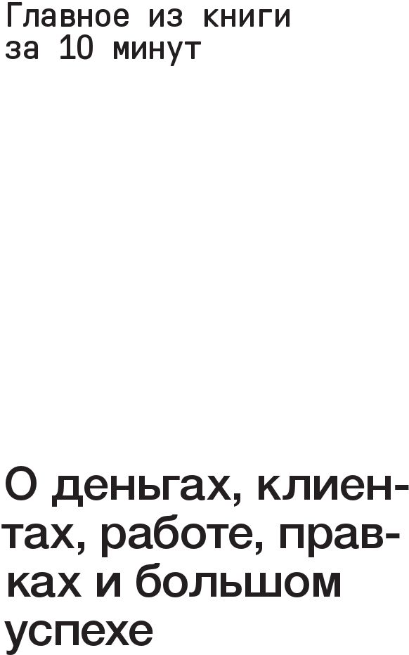 Каждому из этих вопросов посвящены отдельные части – кроме непосредственного ремесла (как рисовать, писать тексты и т. д.). Книга проведет вас по основным принципам клиентского сервиса и управления проектом, а также покажет, что такое хорошая самопрезентация.