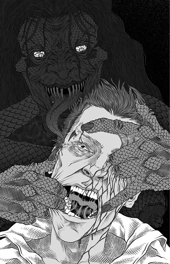 И вдруг человеческие черты слетели с нее, как вуаль, и в серости зарождающегося солнца Коля увидел перед собой речное чудовище. Оно ощерилось двойным рядом кривых черных зубов, выпучило зеленые глаза с красными прожилками, всплеснуло чешуйчатыми лапами с перемычками между пальцев и с изогнутыми, как крючья, когтями. Эти когти впились Коле в кожу на груди, на шее, разодрали щеки и проткнули левый глаз.