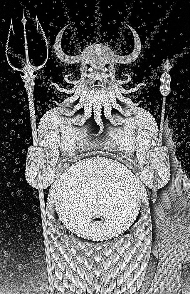 Он огромен и стар. Тело его рыхлое, морщинистое, наполненное водой, грязью, илом. В складках большого живота забились водоросли и рыбьи кости. Сквозь мощный лысый череп пробиваются тонкие кусочки кораллов, совершенно непонятно как там оказавшихся.