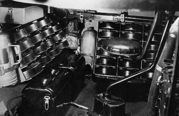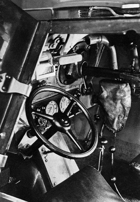 Внутренний вид бронеавтомобиля ЛБ-62: видно рулевое управление, рычаги и щиток приборов, курсовой пулемет, укладки пулеметных дисков к ДТ, запасного ДТ, огнетушителя, ящиков ЗИП и сиденье пулеметчика (АСКМ).