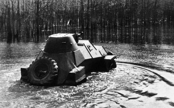 Бронеавтомобиль ЛБ-62 с односкатными колесами (машина № 713) форсирует реку. Апрель 1941 года (АСКМ).
