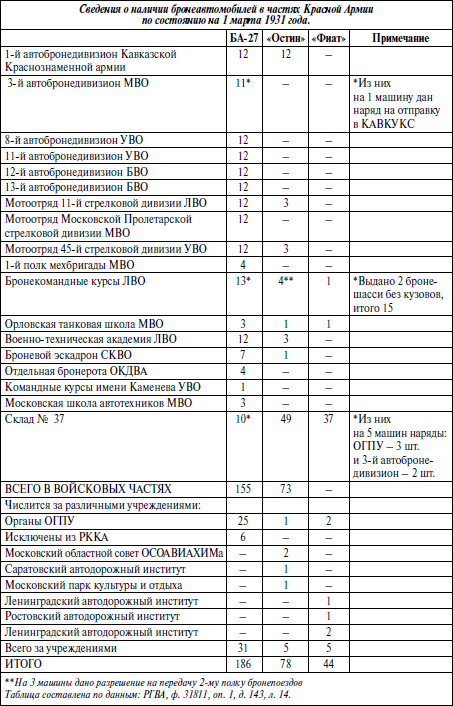 ТАНКОВЫЕ ВОЙСКА. После окончания Гражданской войны в России по состоянию на 1 июля 1922 года в бронечастях Красной Армии имелось 35 автоброневых отрядов, три автопулеметных взвода и отдельная учебная бригада бронеотрядов, имевшие на вооружении пушечные и пулеметные бронемашины постройки 1914–1920 годов. В связи с переходом РККА на штаты мирного времени была проведена реорганизация броневых частей: автобронеотряды расформировали, а на их базе создали отдельные автоброневые дивизионы по 12 бронеавтомобилей в каждом. К 1 января 1929 года в Красной Армии насчитывалось шесть таких дивизионов – №№ 1, 3, 8. 11, 12 и 13.