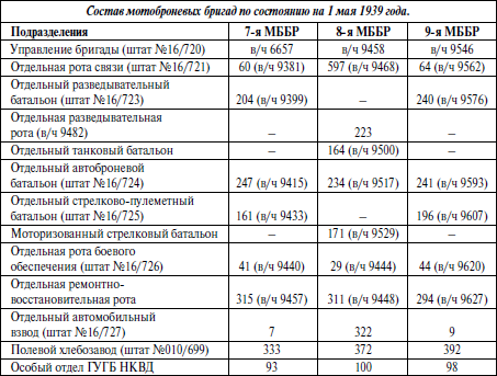 Особая мотоброневая бригада (специального назначения) вооружалась бронеавтомобилями БА-6. Ее командиром-комиссаром стал комбриг В.Ф.Шипов, начальником штаба майор Кагарманов. Директивой Генерального Штаба РККА № 4/4/47068 от 13 января 1937 года в составе бригады насчитывалось 1415 человек и она имела в своем в составе управление, роту связи, разведывательный, бронетанковый и стрелково-пулеметный батальоны, роту боевого обеспечения, ремонтно-восстановительную роту, отдельный автотранспортный взвод и автохлебозавод.