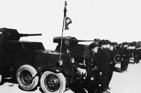 Экипажи БА-27 из состава броневого дивизиона войск ОГПУ перед началом маневров. Казахстан, сентябрь 1932 года (АСКМ).