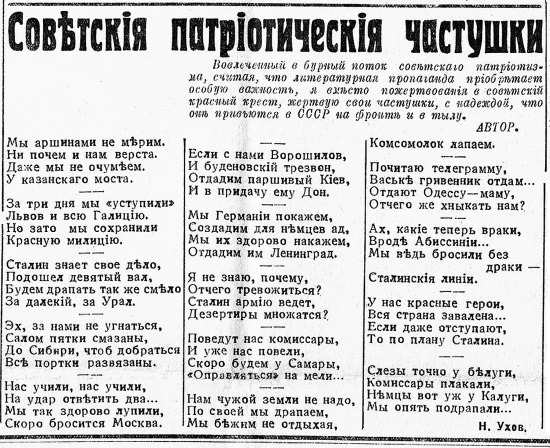 Уже в самом начале войны 30 июля 1941 года в шанхайской газете «Русское время» выходит целая полоса сатирических материалов: антисталинская басня «Знатный осел» (за авторством некоего Дубровина) и подборка «советских патриотических частушек» Н. Ухова, который выражал надежду, что «они привьются в СССР на фронте и в тылу».
