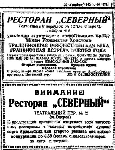 Ресторан «Северный»-«Nord» (Театральный переулок, 12) открыт от 8 часов утра, начало выступлений в 6 час. Вечера при участии Петра Лещенко и Веры Белоусовой с джаз-оркестром под управлением Петра Нечаева.
