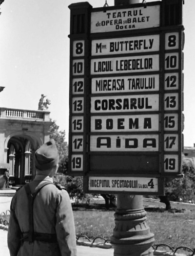 Румынский солдат в Одессе изучает театральную афишу.