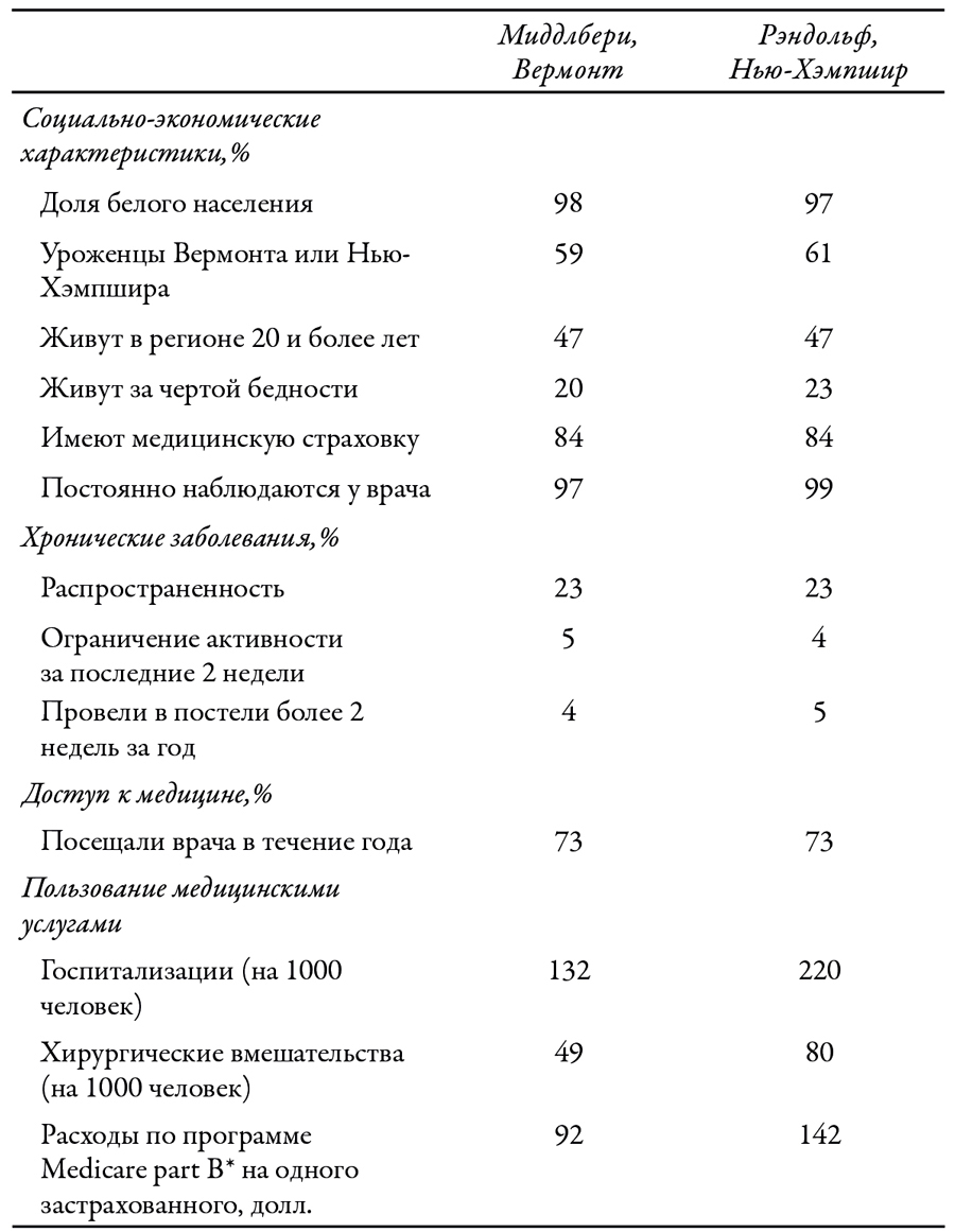 Веннберг был в глубоком замешательстве. Неужели он наткнулся на какую-то странную особенность маленьких вермонтских городков? Он решил расширить исследование на другие районы Новой Англии. Вот его попытка сравнить Миддлбери в штате Вермонт и Рэндольф в штате Нью-Хэмпшир. Взгляните на первые 10 строк: города-близнецы, правда? А теперь – на последние три строки данных. О господи… В Рэндольфе врачи словно пребывали в каком-то кофеиновом угаре: сорили деньгами, госпитализировали и оперировали всех подряд. А Миддлбери? Миддлбери был как будто из другого мира.