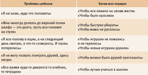 Помогаем ребенку понять, зачем ему нужен порядокСоставьте вместе с ребенком список причин, для чего ему быть более организованным и наводить порядок, что это ему даст. Вы можете взять за основу список проблем ребенка, тогда ему будет проще понять, что должно дать наведение порядка.