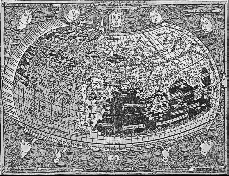 [Закрыть], чья первоочередная задача – удовлетворить жажду чудесного, рассказывая о далеких недоступных странах, и все эти книги писались людьми, никогда не видевшими те места, о которых они вели речь, потому что авторитет традиции ставился тогда выше, чем авторитет опыта. Карта претендовала не на то, чтобы передать форму Земли, но на то, чтобы перечислить города и народы, могущие там повстречаться.