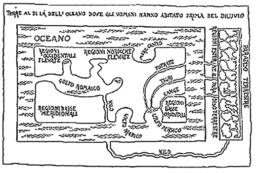 Еще Косма показывает Землю так, как если бы мы глядели сверху. Это рама Океана. По ту сторону находятся земли, в которых Ной обитал до всемирного потопа. На самом дальнем востоке от этих земель, отделенный Океаном от краев, обитаемых чудовищными тварями, располагается Земной Рай. Истекая из него, Евфрат, Тигр и Ганг, пройдя под Океаном, втекают в Персидский залив. Нил же имеет более извилистое русло, течет по допотопной земле, входит в Океан, возобновляет свой бег по низовому полуденному краю, а именно по земле Египта. Затем он впадает в Римский залив, то есть в Геллеспонт[216]216