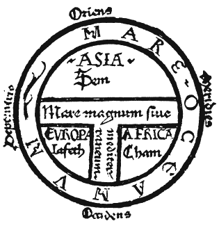Верхняя часть – это Азия; она наверху, потому что в Азии, согласно легендам, находится Земной Рай; горизонтальная палочка представляет с одной стороны Черное море, а с другой – Нил; вертикальная палочка – Средиземное море, так что левая четвертушка круга соответствует Европе, а правая – Африке. И все объято большим кругом Океана.