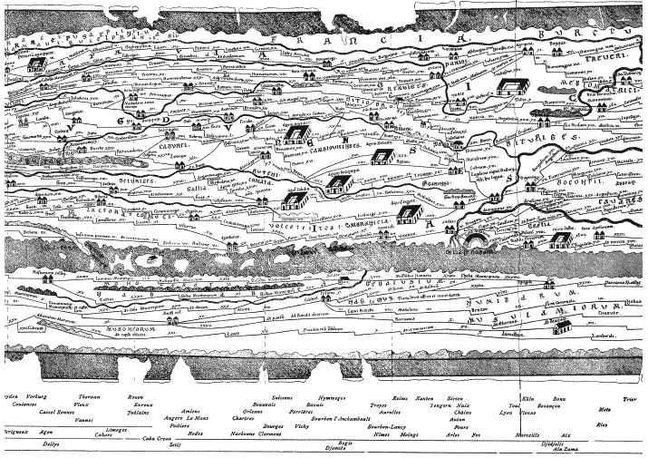 Верхняя ее часть представляет Европу, нижняя – Африку, и это в точности та же ситуация, что и на железнодорожной карте. По карте можно проследить, откуда выходят дороги и куда приводят, но по ней невозможно судить о форме Европы, Средиземноморья или Африки (хотя, конечно, римляне должны были располагать куда более точными географическими сведениями). Однако форма континента интересовала их гораздо меньше, чем указание – какая дорога ведет, скажем, из Марселя в Геную.