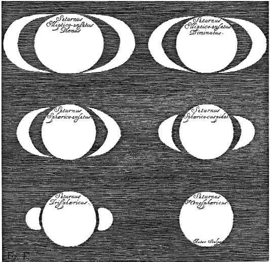 Первоначально он говорил, что видел не одну звезду, а три сочлененные вместе, в линию, параллельную горизонту, и изобразил увиденное в форме трех кружочков. В последующих текстах он утверждал, что Сатурн может являться в форме оливы, и наконец толковал уже не о трех телах или об одной оливе, но о «двух полуэллипсах с двумя весьма затемненными треугольниками посередине указанных фигур», и Сатурн у него весьма смахивает на Микки-Мауса.