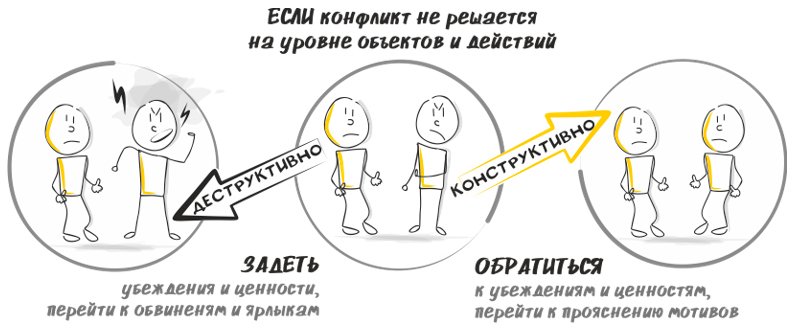 Этот же принцип можно использовать и во благо, переходя на уровень выше, чтобы разрешить противоречие. Обычно на низком логическом уровне (объектов и действий) есть непримиримые противоречия, а на уровне ценностей и целей их нет. И тогда появляется возможность управлять противоречием, переводить конфликт в конструктив и выстраивать стратегию сотрудничества, при которой выигрывают оба. И спор разрешается конструктивно и экологично для обеих сторон.