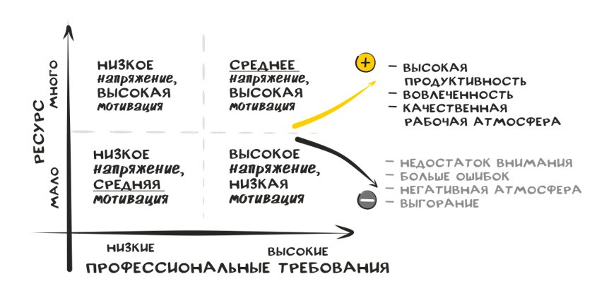 Само по себе напряжение не приводит к высокому психологическому стрессу. Речь идет о балансе напряжения и широты ресурсов, которые предлагает работа. Чтобы качественно реализовывать цели проекта важно понимать, на что может опереться сама команда, чтобы ее работа была более эффективной, а состояние каждого ее члена более благополучным.