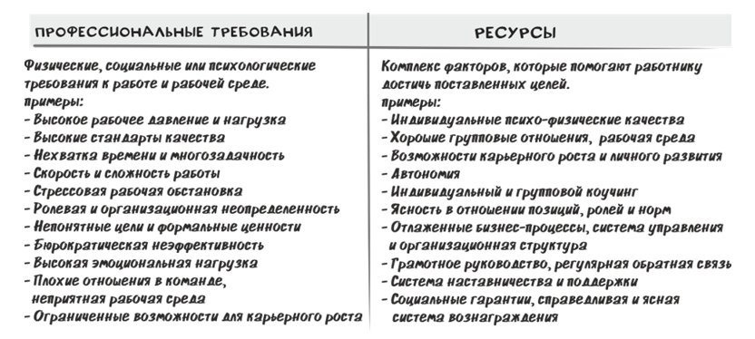 [Закрыть]. Главная ее идея состоит в том, что стресс возникает из-за дисбаланса между двумя составляющими: требованиями (затратами) к работе и ресурсами, которые сотрудник имеет для выполнения этих требований (восполнения затрат).