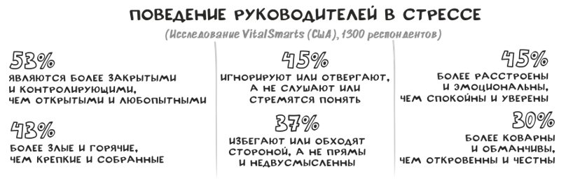 Люди сказали, что, когда их лидер замолкает или взрывается под давлением, они c большей вероятностью делают то же самое. Они реже выходят за рамки своих обязанностей, чаще расстраиваются и теряют вовлеченность. Очень быстро формируется неприятный эмоциональный фон и общее недовольство рабочей атмосферой, снижается моральный дух, растет вероятность несоблюдения сроков, бюджетов и стандартов качества.