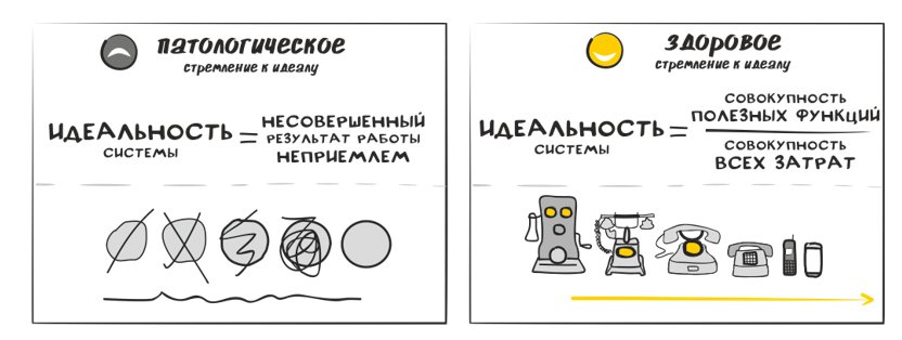 Любая система стремится к идеальности. Но в этом стремлении хорошо бы понимать, что это такое. На самом деле идеальность – это совершенно не то, что вкладывают в это понятие перфекционисты. Здесь нам на помощь придет системное мышление и ТРИЗ (теория решения изобретательских задач) с формулой идеальности для системы. Сравните два варианта стремления к идеалу.