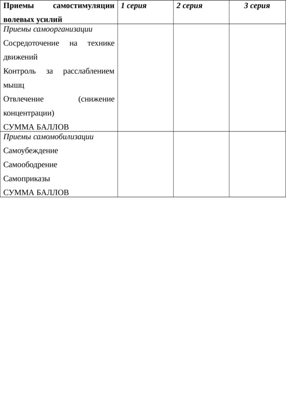 Инструкция: «Вам предлагается участвовать в лично-командном соревновании с заданием работать как можно дольше своего соперника по паре и этим внести вклад в командную победу. Одновременно с работой необходимо вести наблюдение за приемами самостимуляции волевых усилий и их интенсивностью и оценивать их по шестибалльной шкале (5 – очень сильно, 4 – сильно, 3 – средне, 2 – слабо, 1 – очень слабо, 0 – не использовал вовсе). Замеры производятся троекратно – в начале, середине и конце работы. Данные самооценки заносятся в протокол самим спортсменом сразу по окончании выполнения упражнения.