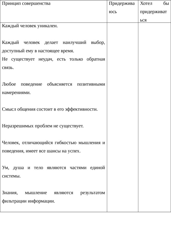2.3.11. Использование принципов совершенстваПрочтите и заполните следующую таблицу. Подумайте о том, какие из указанных в ней принципов уже являются вашими принципами, а какие нет. Почему?
