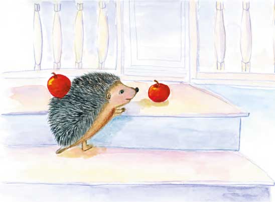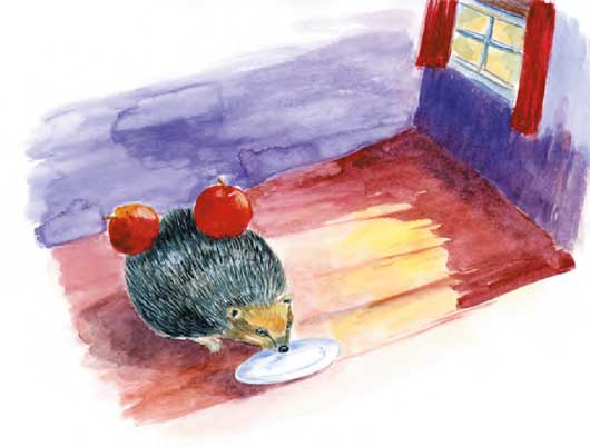 Мама, стараясь никого не разбудить, открыла холодильник, достала молоко и налила его в блюдечко. Поставила блюдце в уголок специально для ёжика. Тот сидел неподвижно, боясь пошевелиться, и только следил за движениями женщины глубоко посаженными глазами-бусинками. Ещё мама достала парочку небольших красных яблочек и тоже положила их на пол.