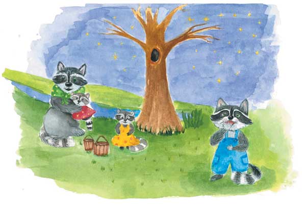 Енот быстро собрался, надел на плечи рюкзачок с питательными побегами растений и отправился в путь. Мама с сестрёнками крепко спали в дупле дуба. Они только что прилегли после сытного ужина на берегу лесного озера. Кстати, упоминание об озере здесь весьма к месту. Мотя отметил для себя, что звёзды падали именно на другой берег озера. Да, теперь он точно знал, куда надо идти.