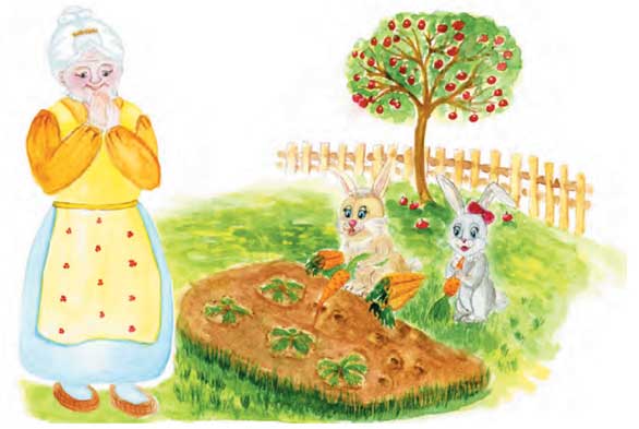 Выйдя утром на крыльцо, бабушка не поверила своим глазам. Посередине морковной грядки сидел серьёзный вислоухий заяц и невозмутимо вытаскивал одну морковку за другой. Ботва была уже очень высокой, и заяц практически зарылся в ней. Бабушка попыталась его прогнать, похлопав в ладоши. Серый никак не отреагировал на хлопки и продолжал методично раскладывать кучки с морковкой.