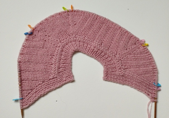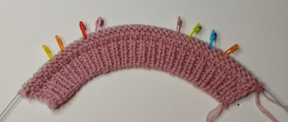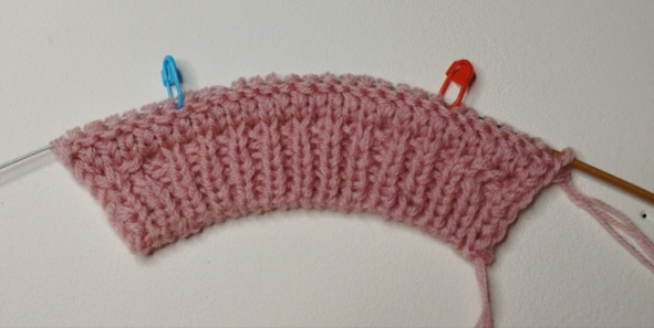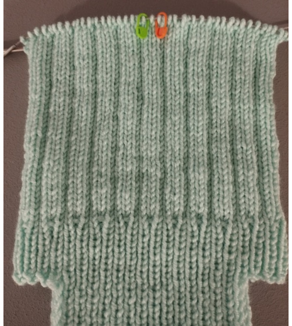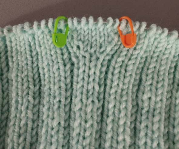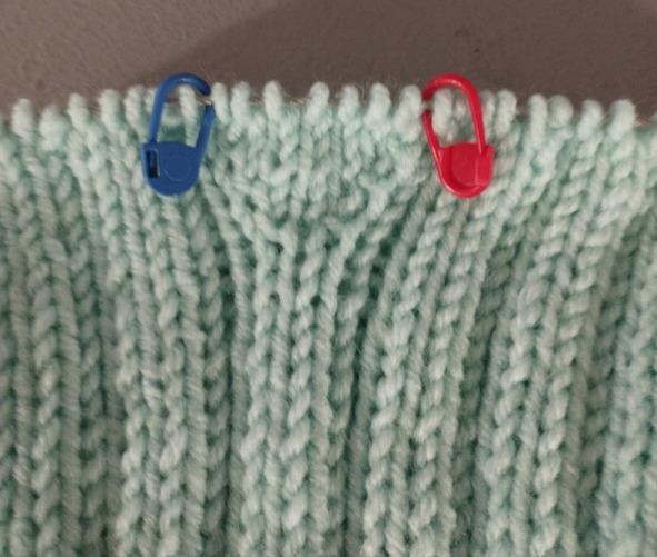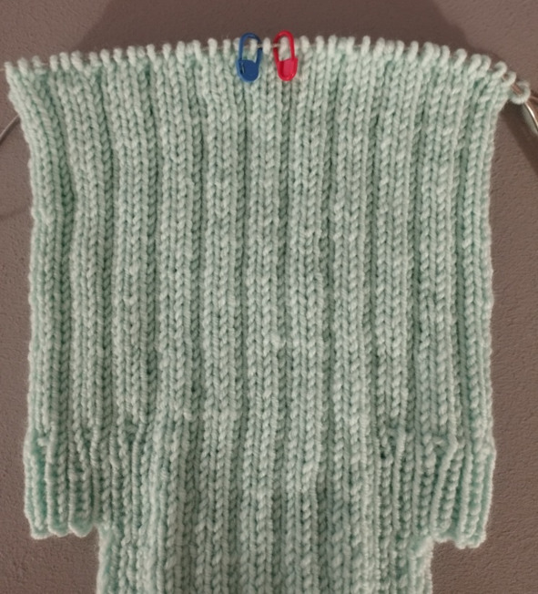 Затем будем вязать ластовицу, для этого нужно повесить маркеры: отсчет идет от синего маркера на спинке – начала кругового ряда