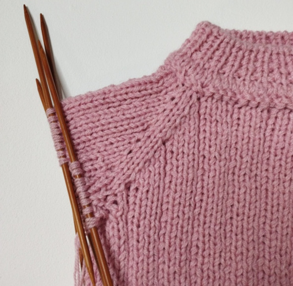 Далее будем набирать петли по бокам, замыкать вязание в круг и вязать по кругу. Вначале спинки повесим маркер, это будет начало кругового ряда в дальнейшем.