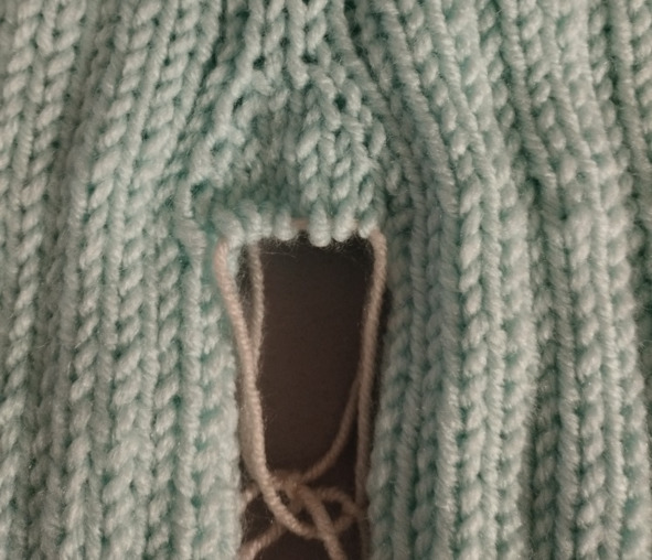 Пропускаем 8 петель левой планки (7 петель левой планки +1 петля реглана = 8) и 28 петель левого рукава (26 петель левого рукава +2 петли реглана по одной с каждой стороны рукава = 28), берем нить от другого мотка пряжи.