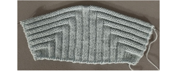 8, 10, 12, 14, 16, 18, 20 ряд: кромочная, (1 лицевая, 1 изнаночная) – повторить 2 раза, 1 лицевая, (3 изнаночных, 1 лицевая) – повторить 5 раз, 1 изнаночная, (1 лицевая, 1 изнаночная) – повторить 2 раза