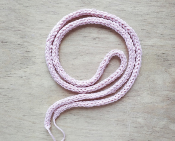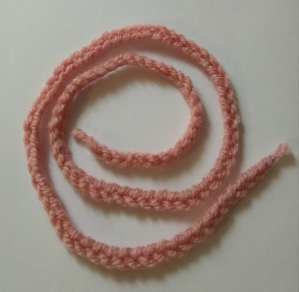 Вяжем шнурочек при помощи крючка (цепочка из 100 петель) и протягиваем его в образовавшиеся дырочки.