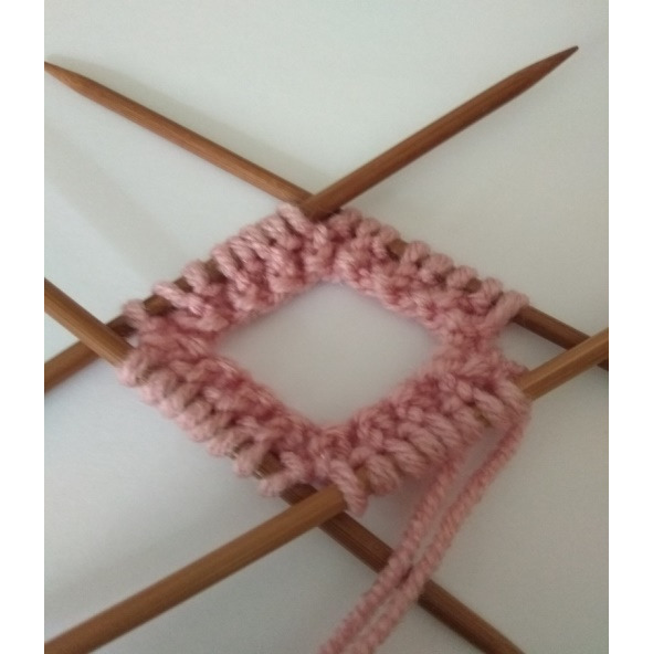 кромочная, 7 изнаночных, две вместе изнаночной – одна из них девятая петля на первой спице, а другая первая петля из другой боковой части, разворачиваем на лицевую сторону