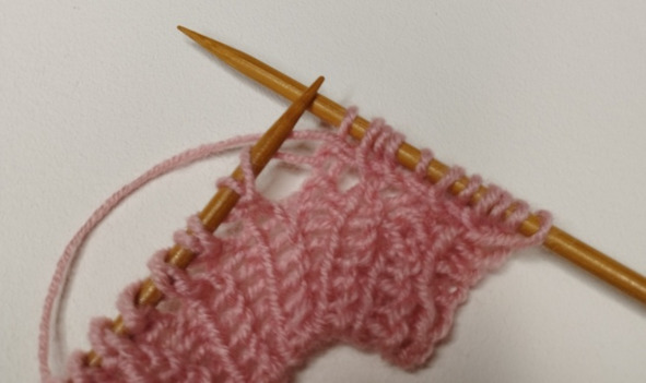 5 ряд: кромочная, 1 лицевая, 1 изнаночная, накид, две вместе лицевой, (1 лицевая, 1 изнаночная) – повторить 10 раз, накид, две вместе лицевой, 1 лицевая, 1 изнаночная