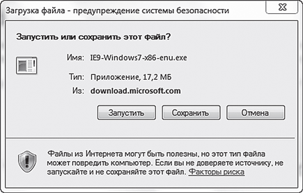 • Ссылки наподобие Скачать, Загрузить. К ним привязаны какие-либо файлы, которые вы можете сохранить на своем компьютере. Как правило, это тексты книг, программы, фильмы или музыка. После нажатия появляется окно (рис. 1.10). Чтобы сохранить заинтересовавший вас файл, необходимо нажать Сохранить. После этого обязательно появится окно (рис. 1.11), в котором следует указать, куда именно нужно сохранить файл. Выбираем папку и нажимаем Сохранить.
