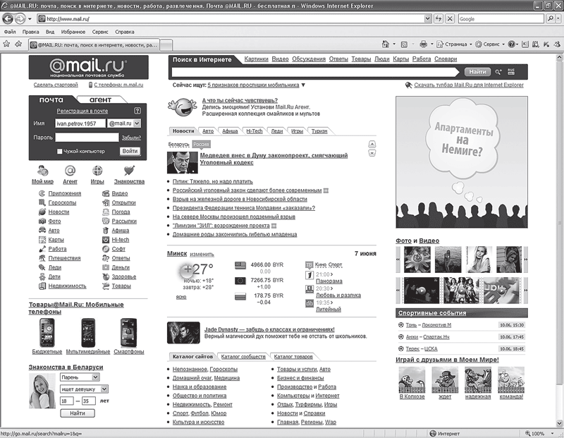 3. В адресную строку вводим адрес того сайта, на котором зарегистрирован ящик; в данном случае это http://www.mail.ru (как уже упоминалось, в адресную строку можно ввести только mail.ru).