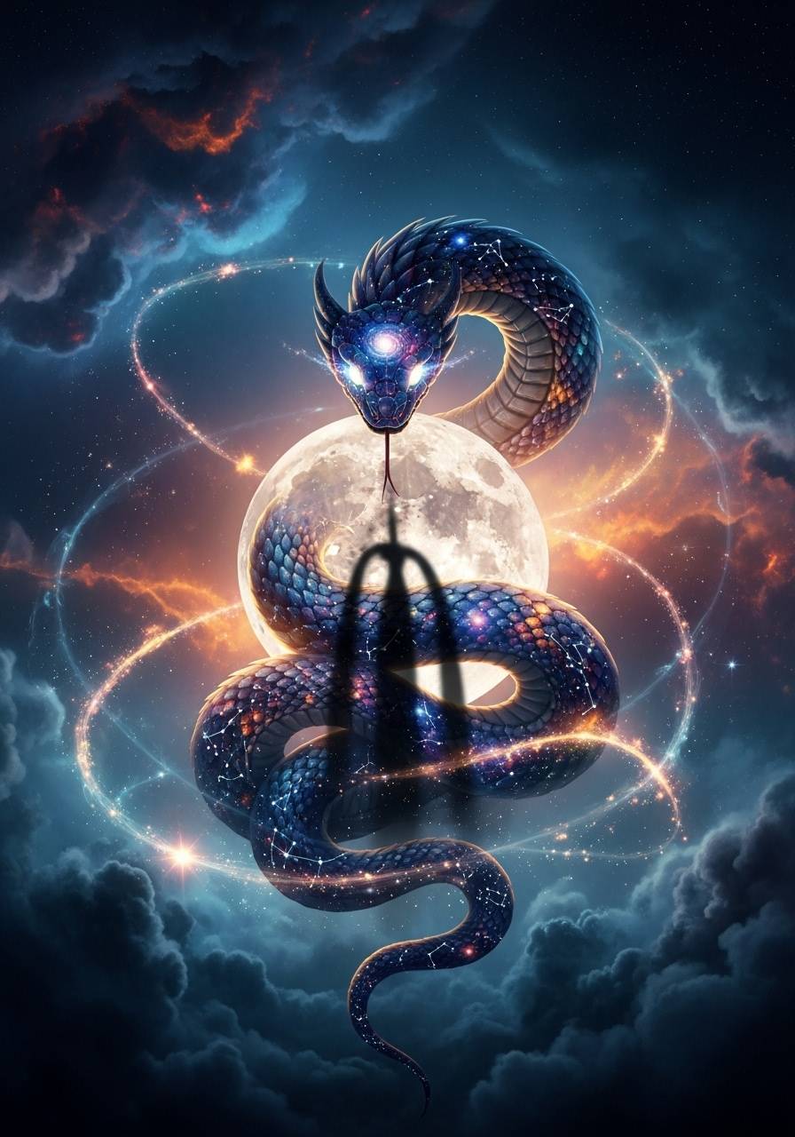 Образ змея без тела, таким образом, – это многослойный символ: иллюзии, желания, тени, трансформации, духовной эволюции через деструктивный импульс. Раху разрушает форму, чтобы раскрылась суть. Он – голова, идущая вперёд, не зная куда, но не способная остановиться.