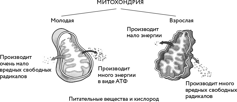 Митохондрии чрезвычайно чувствительны к свободным радикалам, которые сами же и вырабатывают. В здоровой клетке эти свободные радикалы включают и выключают определенные процессы, и это совершенно нормально. Но есть факторы, приводящие к чрезмерной выработке свободных радикалов и повреждению митохондрий и ДНК. Это называется окислительным стрессом [48]. Хроническое воспаление «ломает» наши митохондрии, повреждая их мембраны и мембрану самой клетки, а также снижает уровень фермента NAD+, помогающего клеткам производить энергию. Это называется митохондриальной дисфункцией [49]. Как следствие, мы больше устаем, нам не хватает энергии. Развиваются все уже знакомые нам перечисленные выше болезни старения.