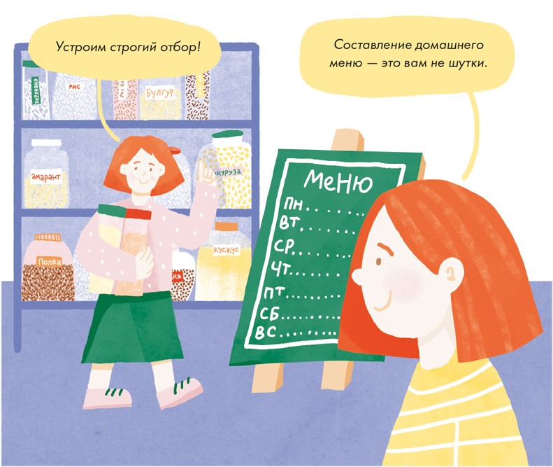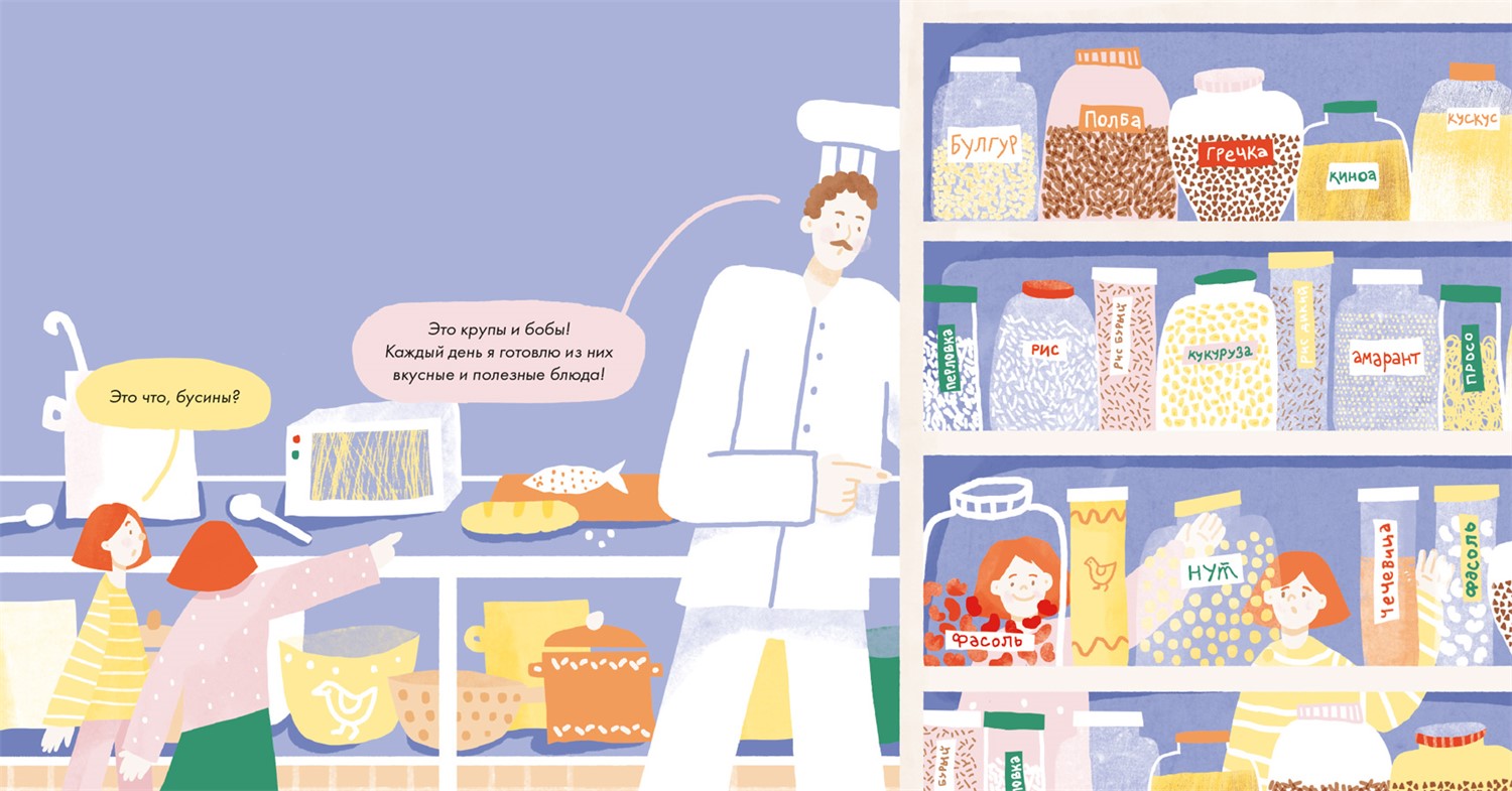 Папа привёл Каю и Миру не просто в ресторан, а на его кухню. Девочки впервые оказались у папы на работе. Здесь столько всего интересного! Огромные кастрюли, необычные инструменты, ряды холодильников… Больше всего девочкам понравились аккуратно расставленные банки с необычными разноцветными зёрнышками.