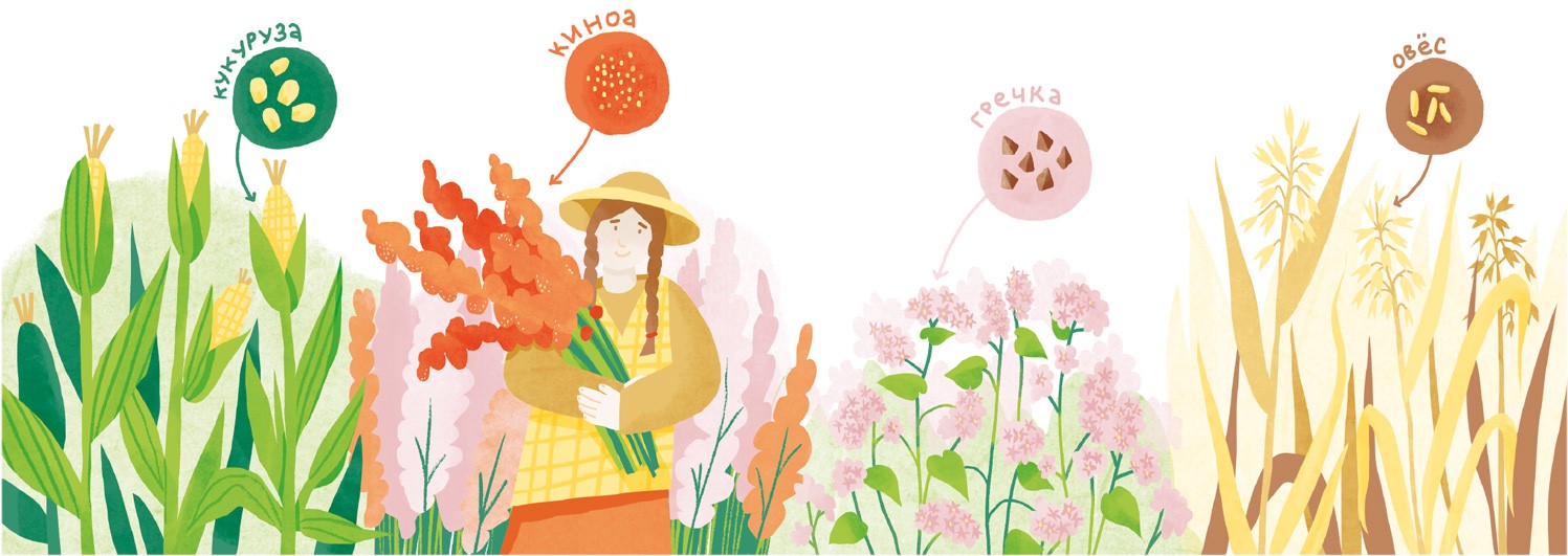 Гречка – это зерно, которое растёт на коротких зелёных стеблях. Фермеры собирают гречку, стряхивая её с растений, а затем очищают. Она очень полезна – в ней содержится более 50 ценных веществ, а ещё много белка. Белок помогает нам расти.