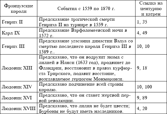 По мнению тех, кто доверяет Нострадамусу, ему был заранее известен последовательный ряд правителей Франции от Генриха II Валуа до Наполеона III (то есть с 1559-го по 1870 год), а также целый ряд событий, происходивших в данный период во Франции (см. табл. 1 и 2).