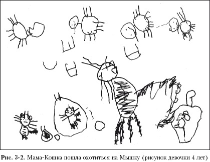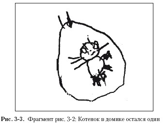 В рисунках трех-четырехлетних детей нередко можно встретить такие простейшие изображения дома. С одним из них можно познакомиться на рис. 3–2. Композиция девочки 4 лет изображает Маму-Кошку, которая пошла охотиться на Мышку. Кошка – полосатая, пушистая, усатая – в центре. Она большая, взрослая, она мама, поэтому ей можно спокойно перемещаться во внешнем мире. Нижняя кромка листа играет в этом мире роль линии земли, а линия неба символизирована летящими друг за другом птичками. Слева от Кошки мы видим первый домик, где остался ее Котенок. На рис. 3–3 домик котенка представлен крупным планом. Домик, похожий на мешочек, имеет округлую замкнутую форму. В нем котенок сидит, как в матке. Сверху – труба, чтобы было понятно, что это дом. Главная функция дома – защита Котенка, который остался один, а его мама ушла. Потому в доме нет ни окон, ни дверей – опасных дыр, сквозь которые что-то чужое может проникнуть внутрь. На всякий случай у Котенка есть защитник: рядом нарисован такой же, но совсем крошечный домик с трубой – это конура, где живет Собака, принадлежащая Котенку. Изображение Собаки не поместилось в таком маленьком пространстве, поэтому девочка обозначила ее темным комочком. Реалистическая деталь – кружочки у домиков – это миски Котенка и Собаки. Теперь мы уже легко опознаем справа домик Мышки, остроносой, с круглыми ушками и длинным хвостом. Мышка – предмет интереса Кошки. Так как на Мышку будет охота, ей сделан большой и замкнутый со всех сторон дом с трубой, где она в безопасности. Слева есть еще интересный персонаж – Котенок-подросток. Он уже большой, и ему можно быть одному на улице.