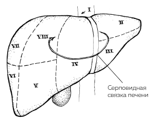 Нумерация сегментов осуществляется по часовой стрелке. Сегмент I (он же хвостатая доля печени) расположен сзади. При фронтальном виде его не видно