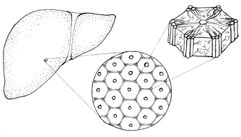 Архитектоника здоровой печени уникальна – она содержит сотни тысяч печеночных долек, представляющих собой усеченные шестигранные призмы.